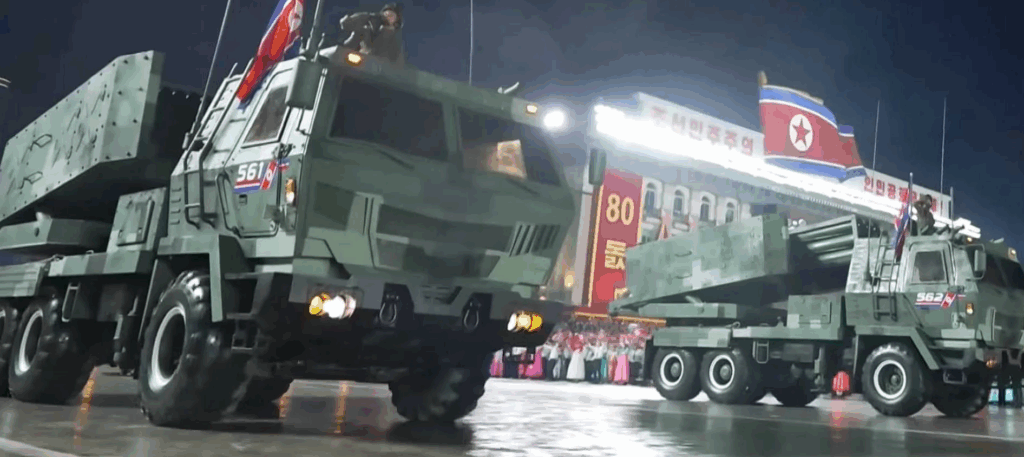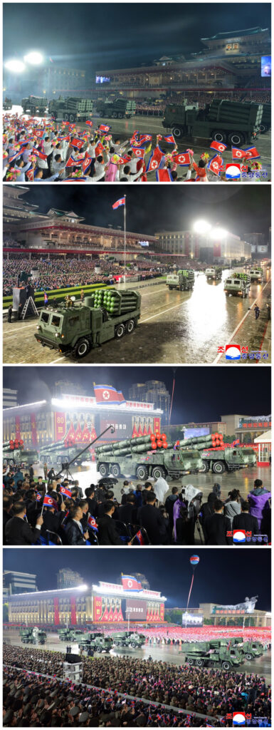 During the parade several MRLS systems where shown, one of the eye-catchers was a apparently new MRLS system. So far there is no designation given to it. But a number of analyst say it has some U.S. HIMARS resembles. Other system paraded where the: KN-25 (600mm), and a so far unknown MRLS system with over 20 unguided rockets.